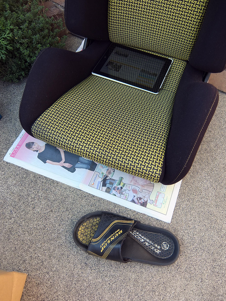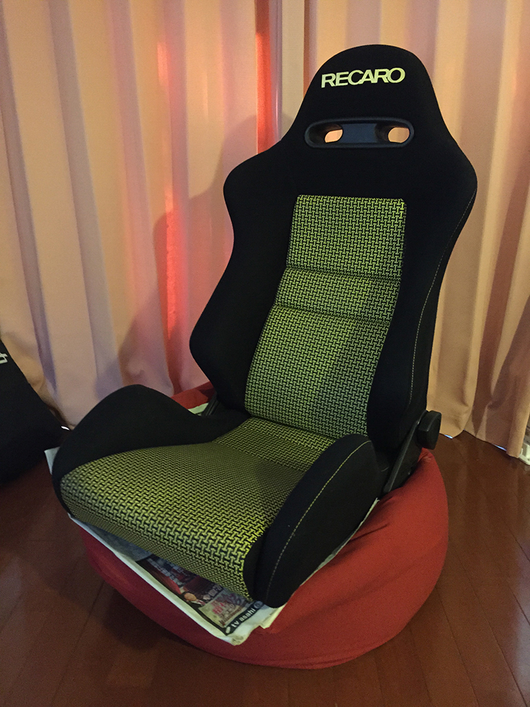 なのでそれまで、買ってきたレカロは、自宅リビングでこんな感じで待機中。「狭い家がまた狭くなる!」と家族の非難ゴウゴウの中、肩身を狭くするレカロなのでした。首もちょっとすくめてる?