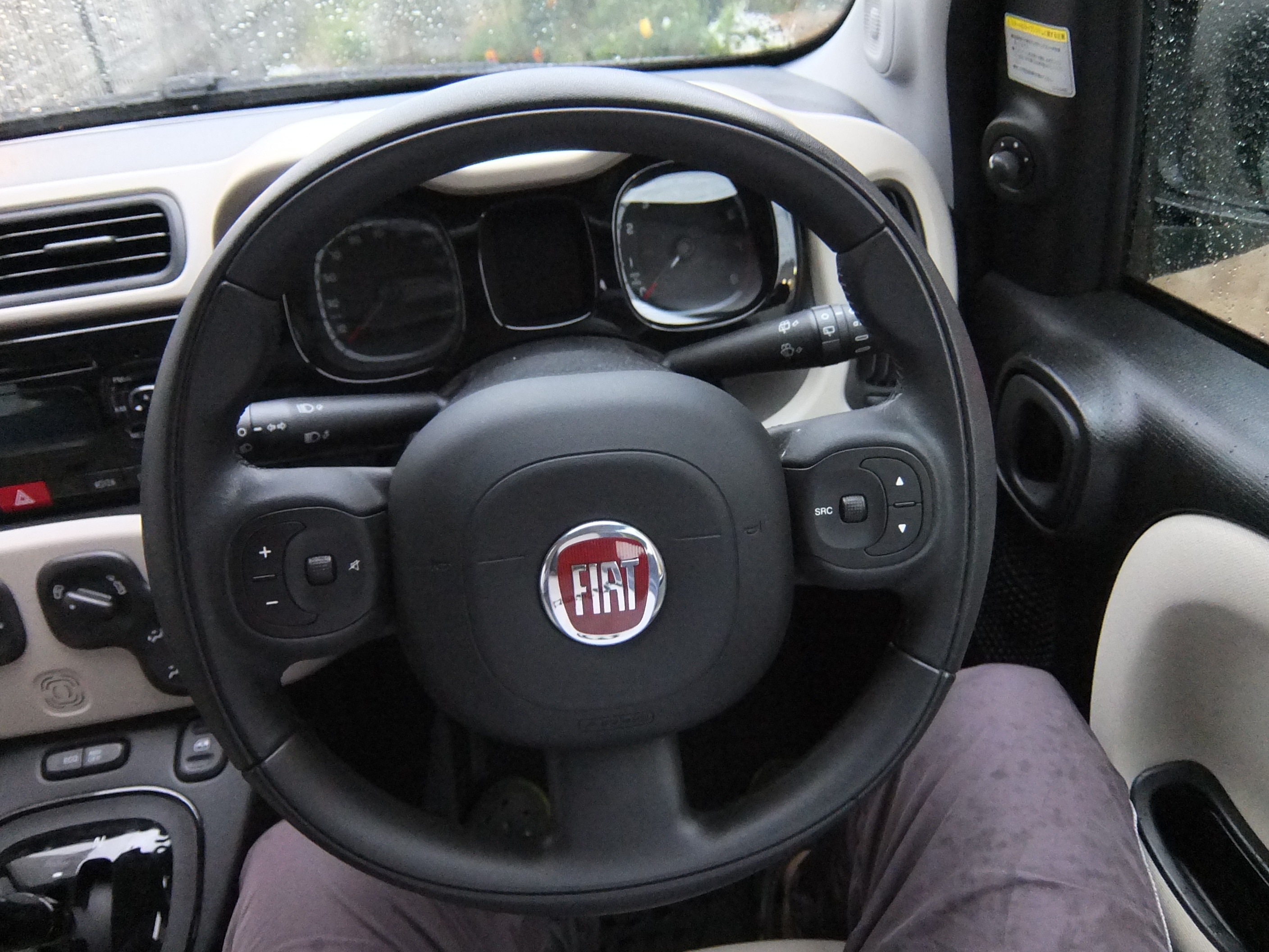 ダッシュボード自体はブラックアウトされていて、陽射しに照らされても昔のマセラティみたいにフロントガラスに盛大に反射して視界をさえぎったりしないんだけど(そこはやっと学んだみたいだ > フィアット)、この「PANDA」のエンボス仕上げが微妙に反射して、フロントグラスにチラチラ反射してうるさい。ま、晴れた昼間に走らなければ気にならないことなんだが。
