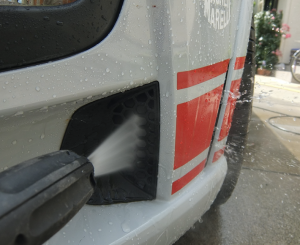 昨日、洗車したときふと思い立って高圧洗浄のノズルをインレットに当てたたら、こんな感じで水が吹きだした。で、慌ててカメラを取りだしてシャッター押したところ。コンデジだとなかなか撮りづらい。