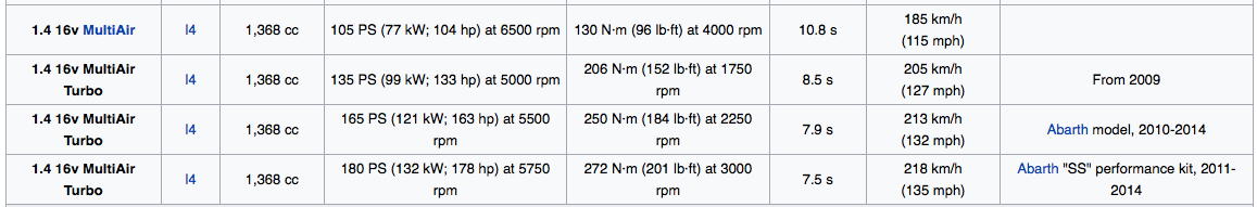 ネットをウロウロしていたら、「Fiat Grande Punto」のウィキペディア英語版のページに辿り着いて。そうしたらこんな表が(クリックで拡大)!