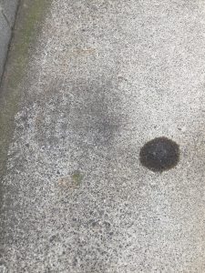 で、翌日。駐車場のフロアにシミ発見。これはもう、アウトですね。