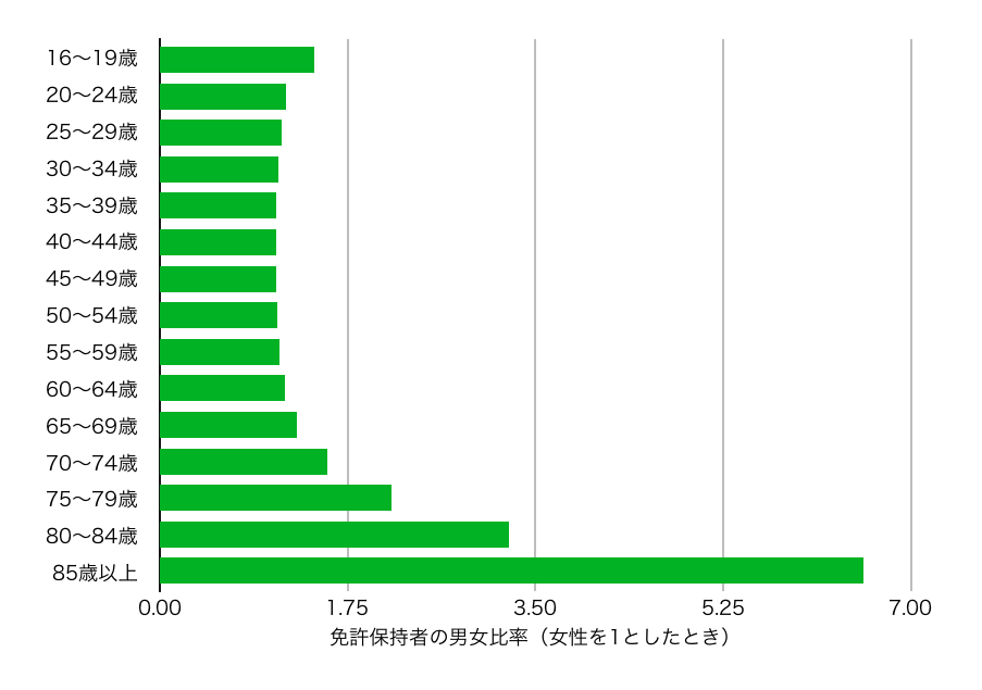 この数字を勘案して免許保有の男女比率を“補正”すると、約4.84。僕ら男はこの年代ともなると女性の約5倍、免許を手放さない。運転に未練タラタラ、という状況が数字から見えてくる。