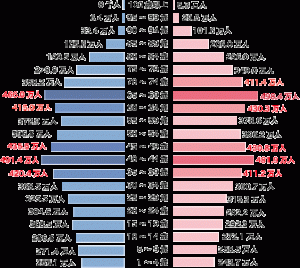 80〜84歳の場合、男性人口199.5万人に対して女性は296.0万人と、女性人口の方が1.5倍ほど多い。