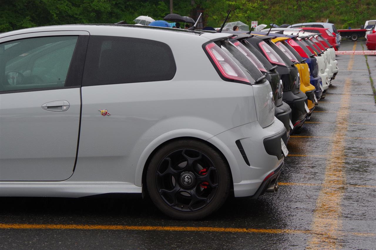 参加車の発案で、今回は向こう側からグランデ、そしてEVO、いちばん手前にプント、と年代順に並んでいる。これもすごい!