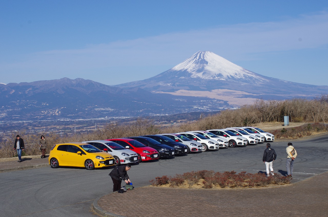 で、我らが「JAPAN ABARTH PUNTO COLLECTIVE」、今年の2月にみんなで伊豆にツーリングに行ってきました。そのときの画像がこれ。