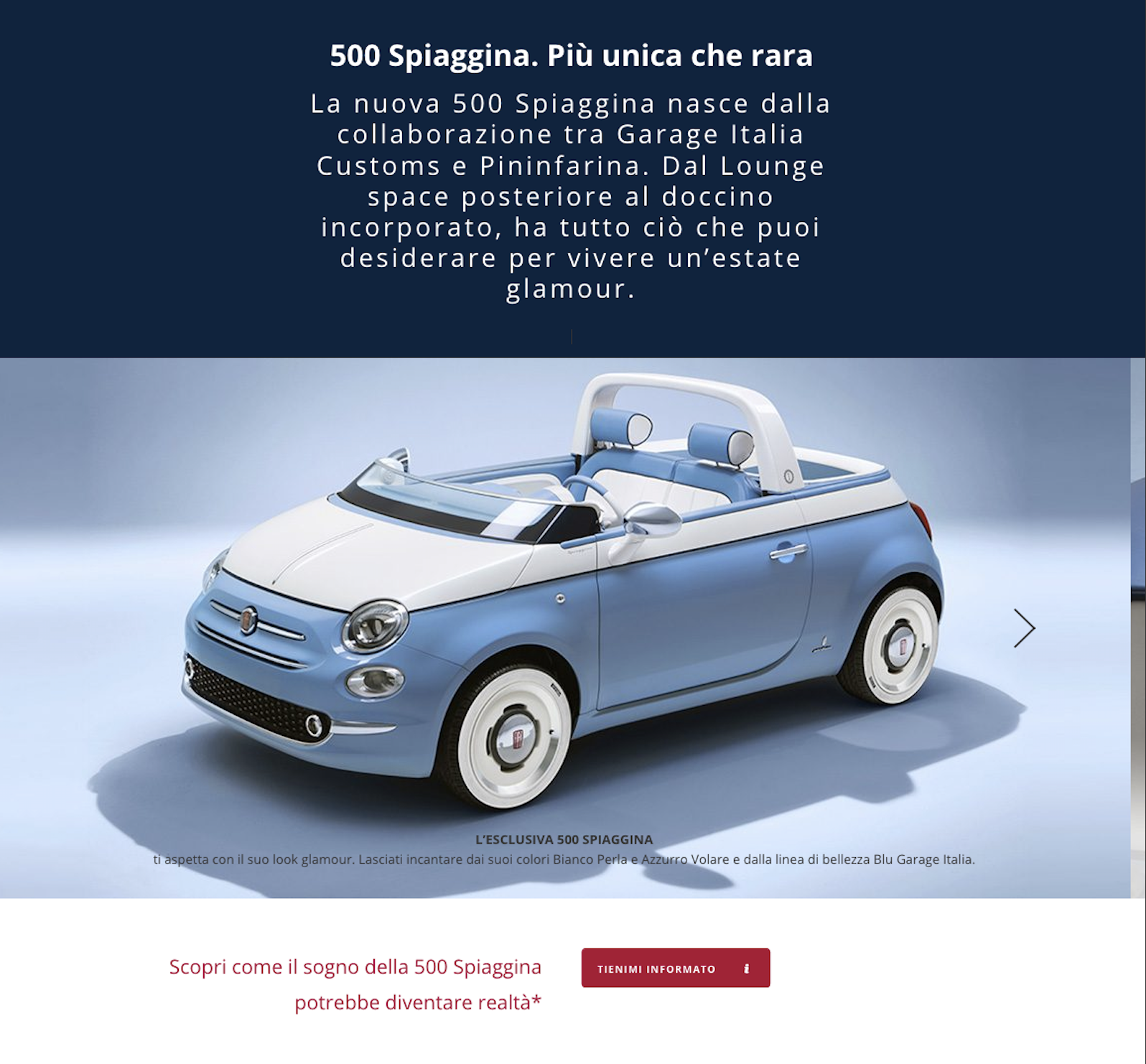 「Spiaggina(ビーチ仕様)」と名付けられたこのFFチンク、上記リンク先によれば立派な生産モデルとのこと。オフィシャルサイトのアイコン画像を見る限りでは、そのまま楽しく乗れそう。ただし2人乗りだけど。