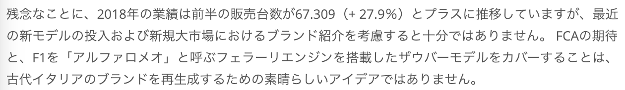 1970年代、アルファロメオは経営不振で国営化された時期があったけど、それにもかかわらずF1のレースをやり続けて、しかも結果が出てなかったのでブーイングされてたけど、あのときとあんまり変わってない気がする。