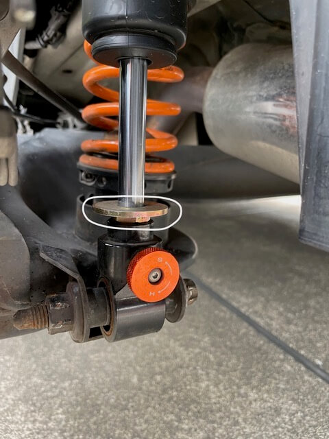白マルで囲んだストッパーが緩んで、アブソーバーの心棒がスポッと抜けた(これは修理後)