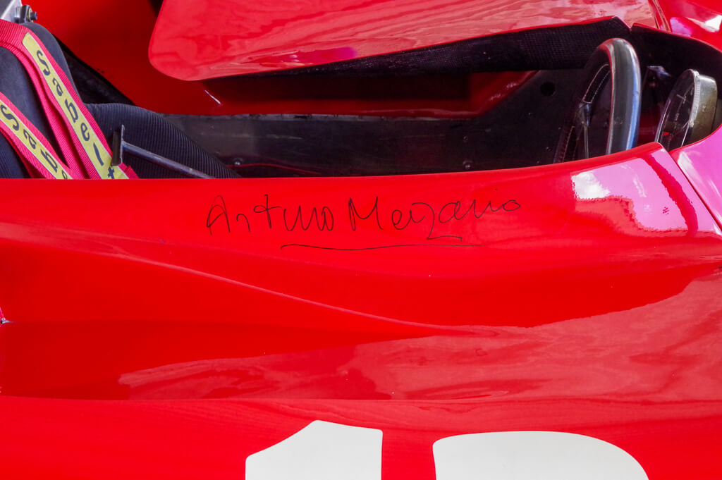 シート脇にサインがしてあって、これ誰だろ? って考えたら、アルトゥーロ・メルツァリオじゃないですか! ワオ!! アルファロメオやフェラーリのスポーツカーレースで活躍した人で、ル・マンとかタルガフローリオとかでも活躍した。この3000SPにも乗ったことがあって、このサインはその証というわけ。